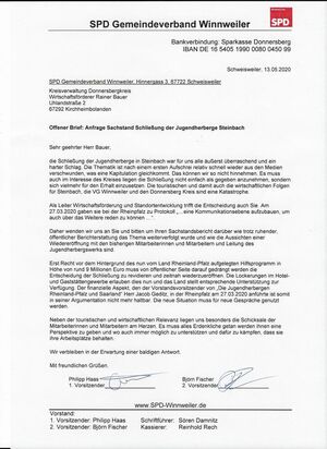 Die Jugendherberge in Steinbach wurde im März plötzlich geschlossen. Wir fürchten, dass die Schließung nach einem ersten Aufschrei ohne weiteres hingenommen wird. Das können wir so nicht akzeptieren und haben uns deshalb heute mit einem offenen Brief an den Wirtschaftsförderer des Donnerbergkreises gewandt.